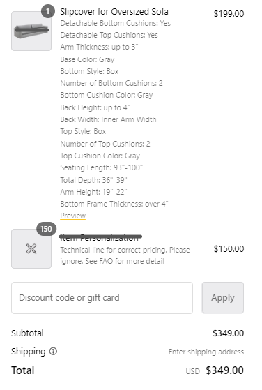 Also, there will be an Item Personalization price line. It's a technical line for correct pricing, you can safely ignore it too.