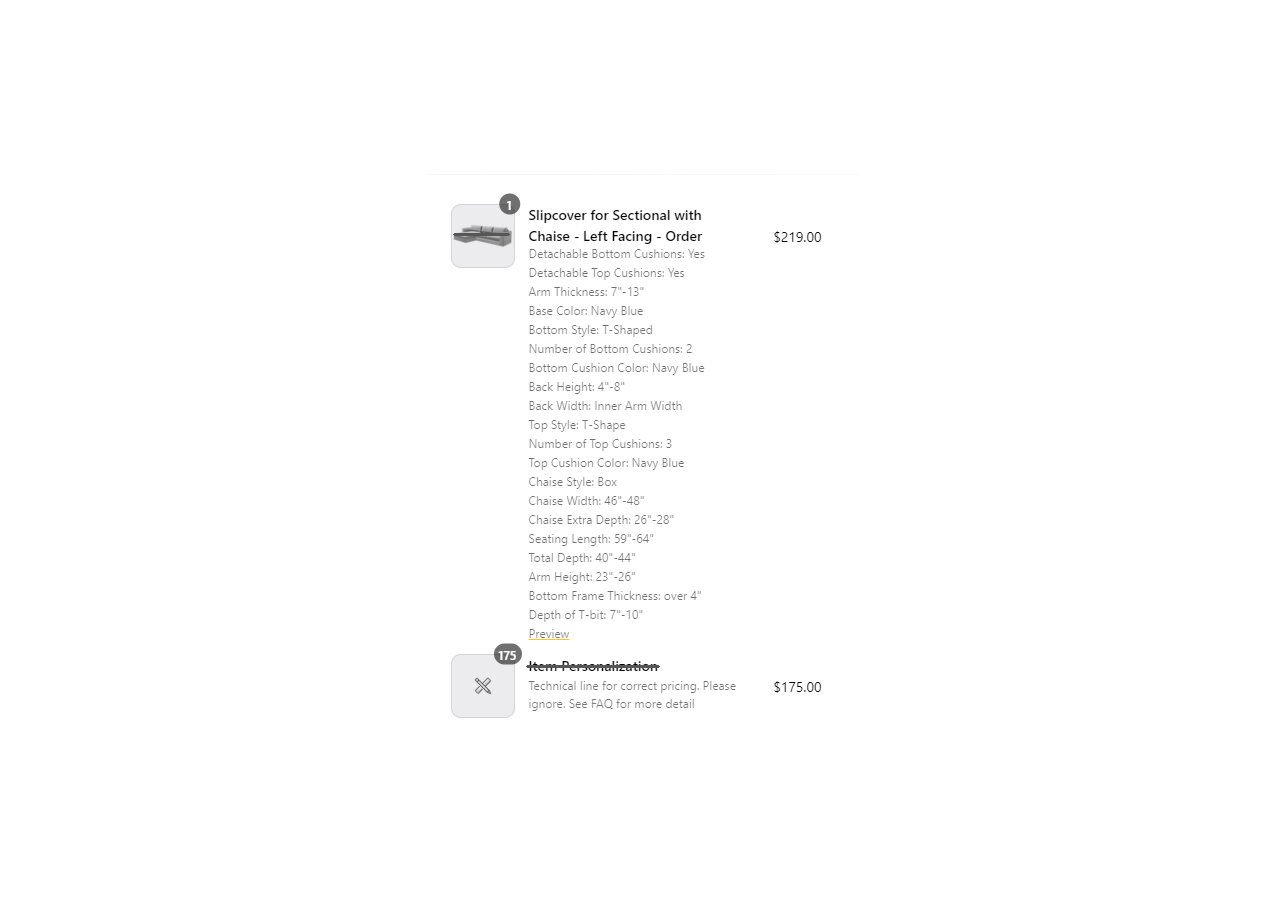 You will see the Slipcover price line with all your choices, but the thumbnail picture will be set to default, which can be safely ignored. You can check your choice by clicking on the Preview line at the bottom.