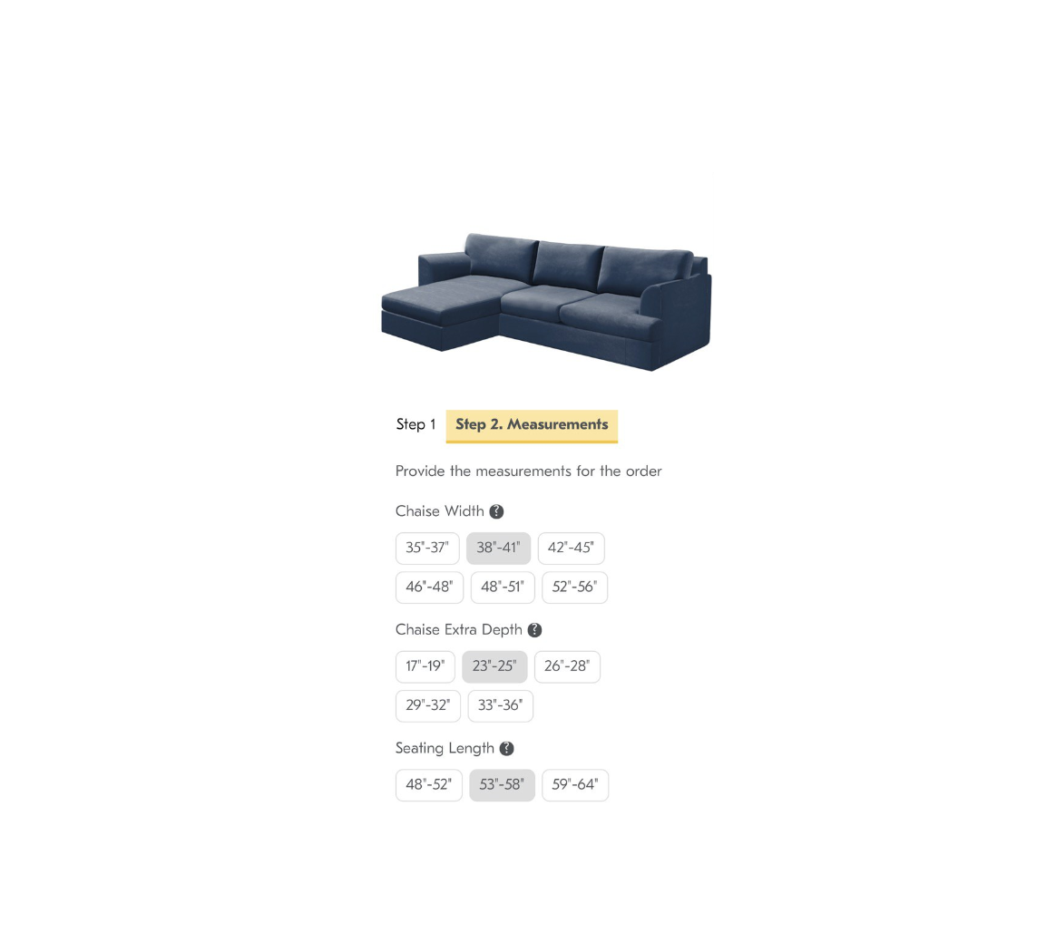 Fill in the measurements that correspond to your furniture. If you don't see the range you need, check the last box and follow the instructions.