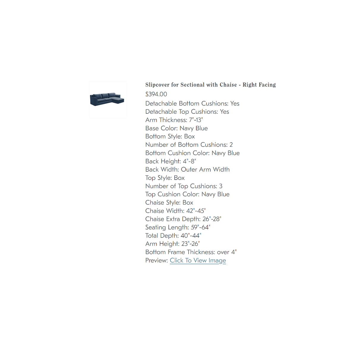 You will see the Slipcover price line with all your choices, but the thumbnail picture will be set to default, which can be safely ignored. You can check your choice by clicking on the Preview line at the bottom.