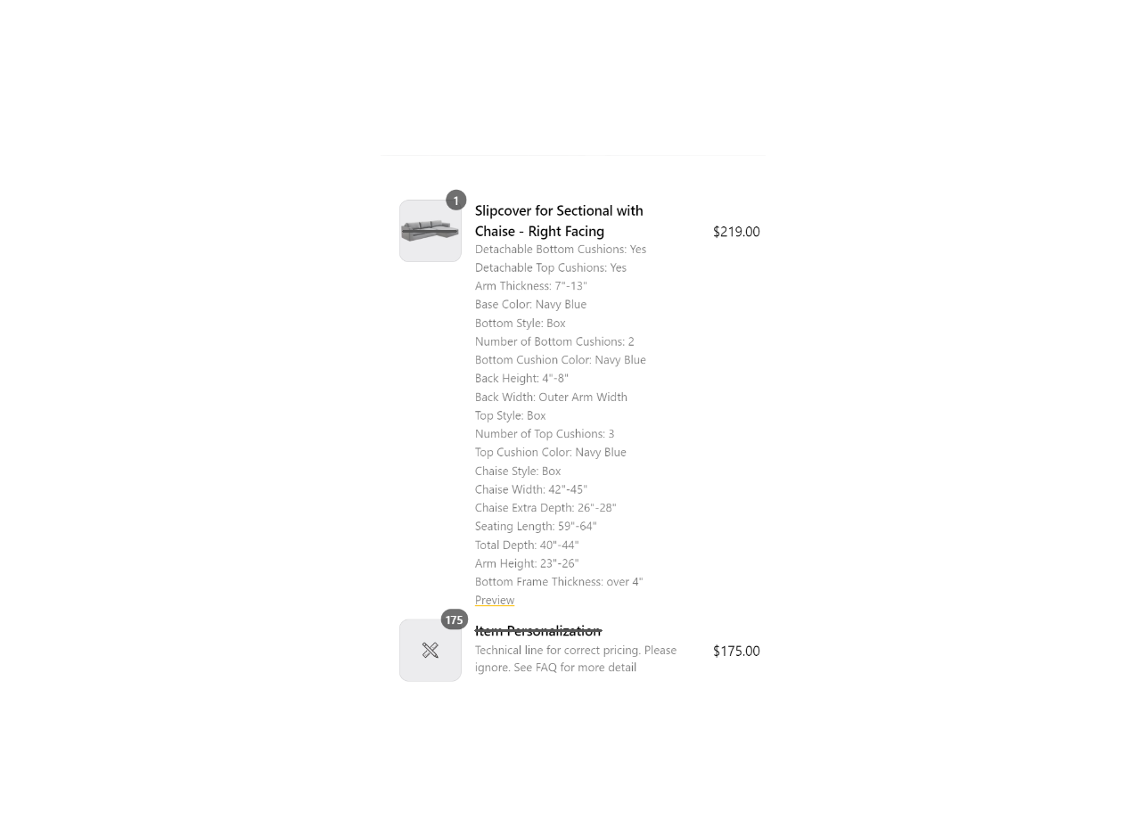 Once complete, the furniture piece in the preview should resemble yours. This is how your slipcover is going to look like in the color you choose. While it won't look like a replica of your furniture, the main elements will be there. Don't worry, the real cover will preserve the original look.
