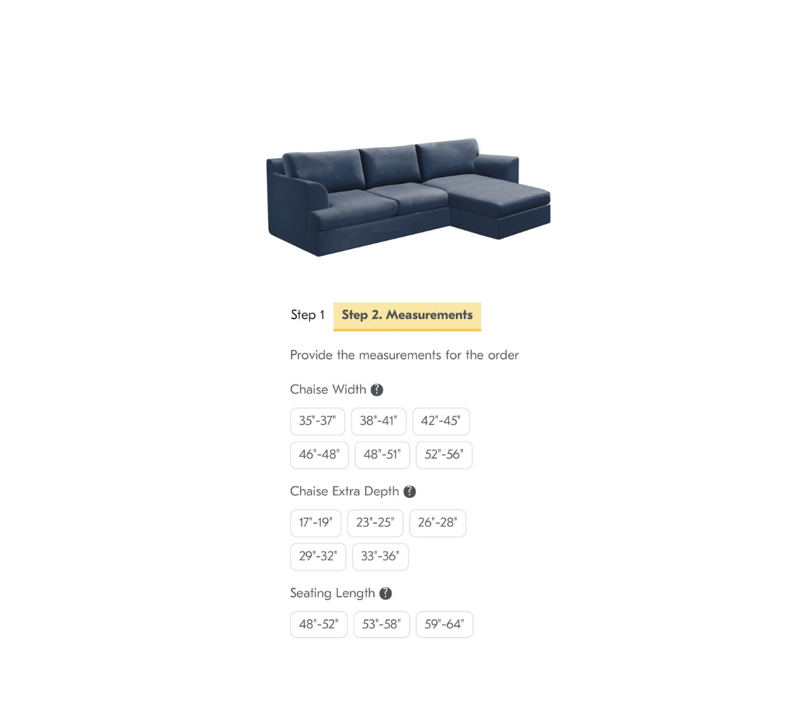 Fill in the measurements that correspond to your furniture. If you don't see the range you need, check the last box and follow the instructions.
